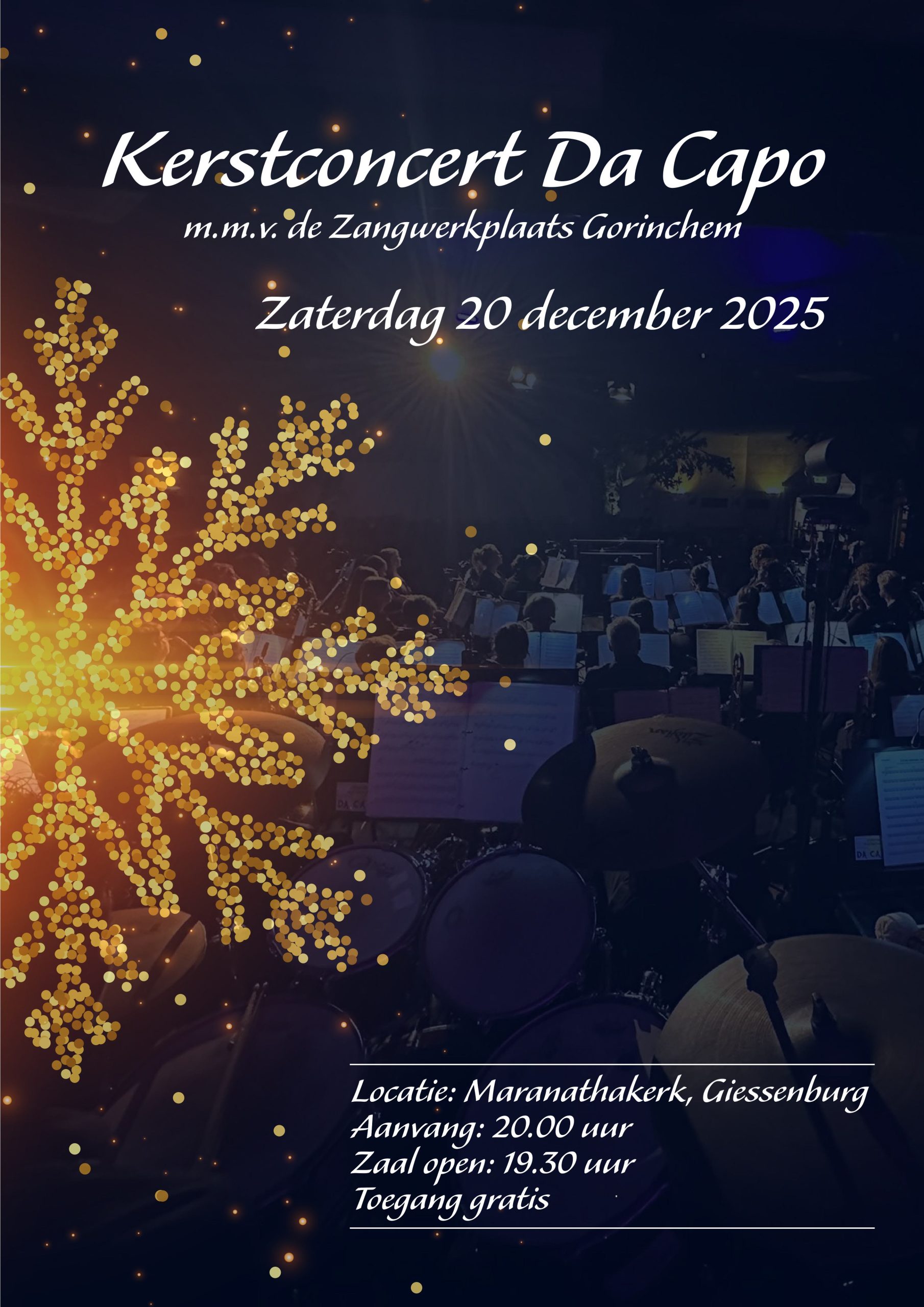 Op zaterdag 20 december verzorgt Muziekvereniging Da Capo het jaarlijkse Kerstconcert, dit jaar in samenwerking met Zangwerkplaats Gorinchem. Het concert vindt plaats in de sfeervol aangeklede Maranathakerk in Giessenburg.
